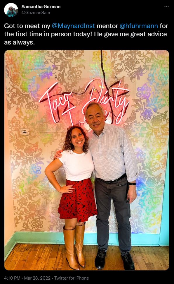 Photo and tweet by Maynard 200 Fellow Samantha Guzman of meeting mentor Henry Fuhrmann for the first time in person in Austin, Texas.
